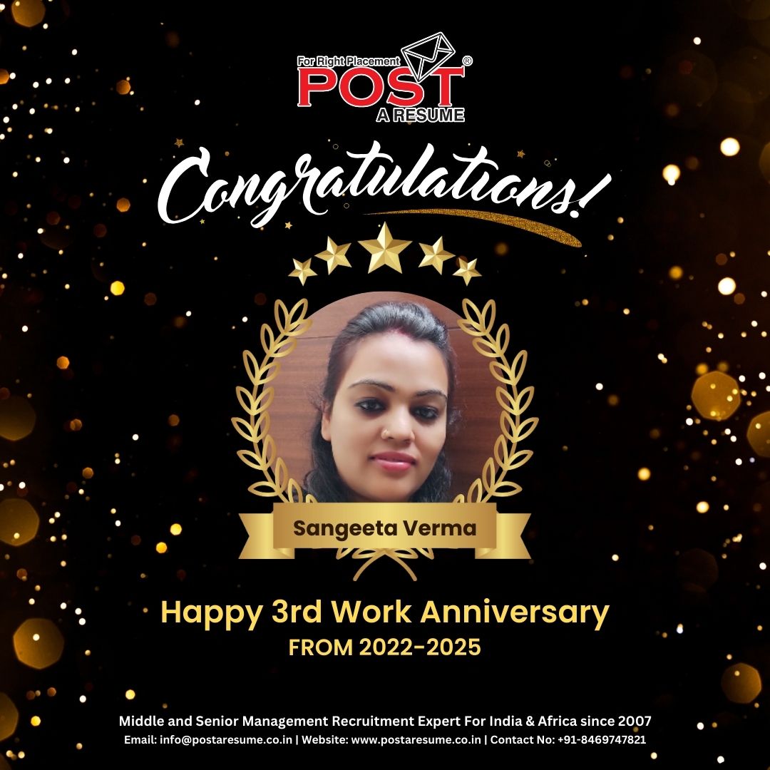Congratulations Sangeeta Verma on your 2nd work anniversary with POST A RESUME Family!