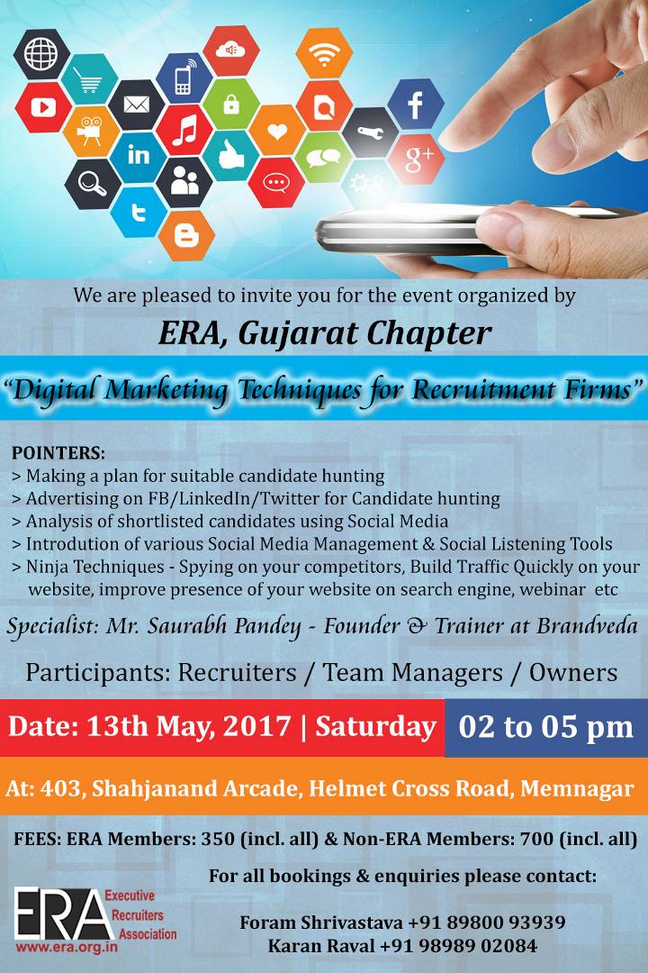 Excellent Initiative by #ERAgujarat chapter. Social Media is the need of the hour for any organisation. Let’s join this event to gain the knowledge about social media. Limited seats and event is reserved for HR Fraternity and Recruitment Firms only.