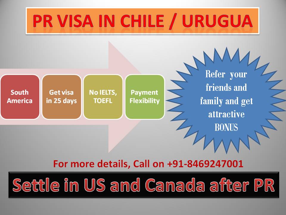Contact us if you are looking for opportunity to get settle in American continent without IELTS, TOEFL or Medical test. We have some excellent offer for you for Chile wherein you will get PR without IELTS, TOFEL or Medical just in 45 days. Once you have PR of these country you can get visa free entry in USA and Canada. Call us for more details on +91-8469247001