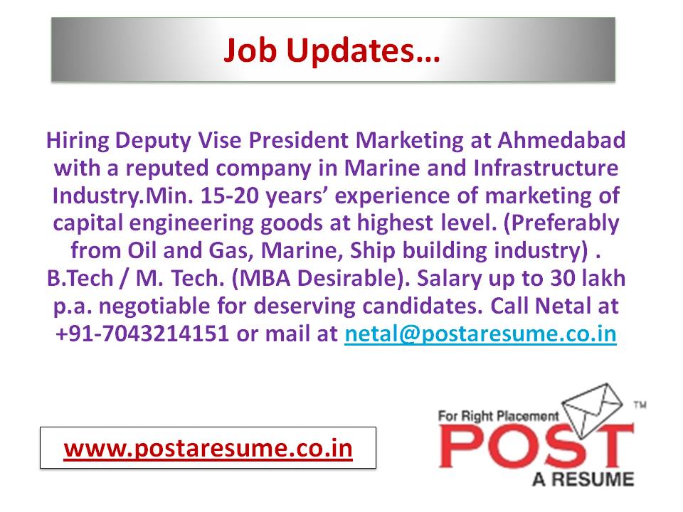 Hiring Deputy Vise President Marketing at Ahmedabad with a reputed company in Marine and Infrastructure Industry.Min. 15-20 years’ experience of marketing of capital engineering goods at highest level. (Preferably from Oil and Gas, Marine, Ship building industry) . B.Tech / M. Tech. (MBA Desirable). Salary up to 30 lakh p.a. negotiable for deserving candidates. Call Netal at +91-7043214151 or mail at netal@postaresume.co.in