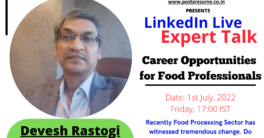 Expert Talk Series Live Session on this Friday, 1st July, 2022 at 5 PM IST. This week our guest is Devesh Rastogi. He will speak on “Career Opportunities for Food Professionals”. We will also attend a live Q&A. You can also submit…Read More »